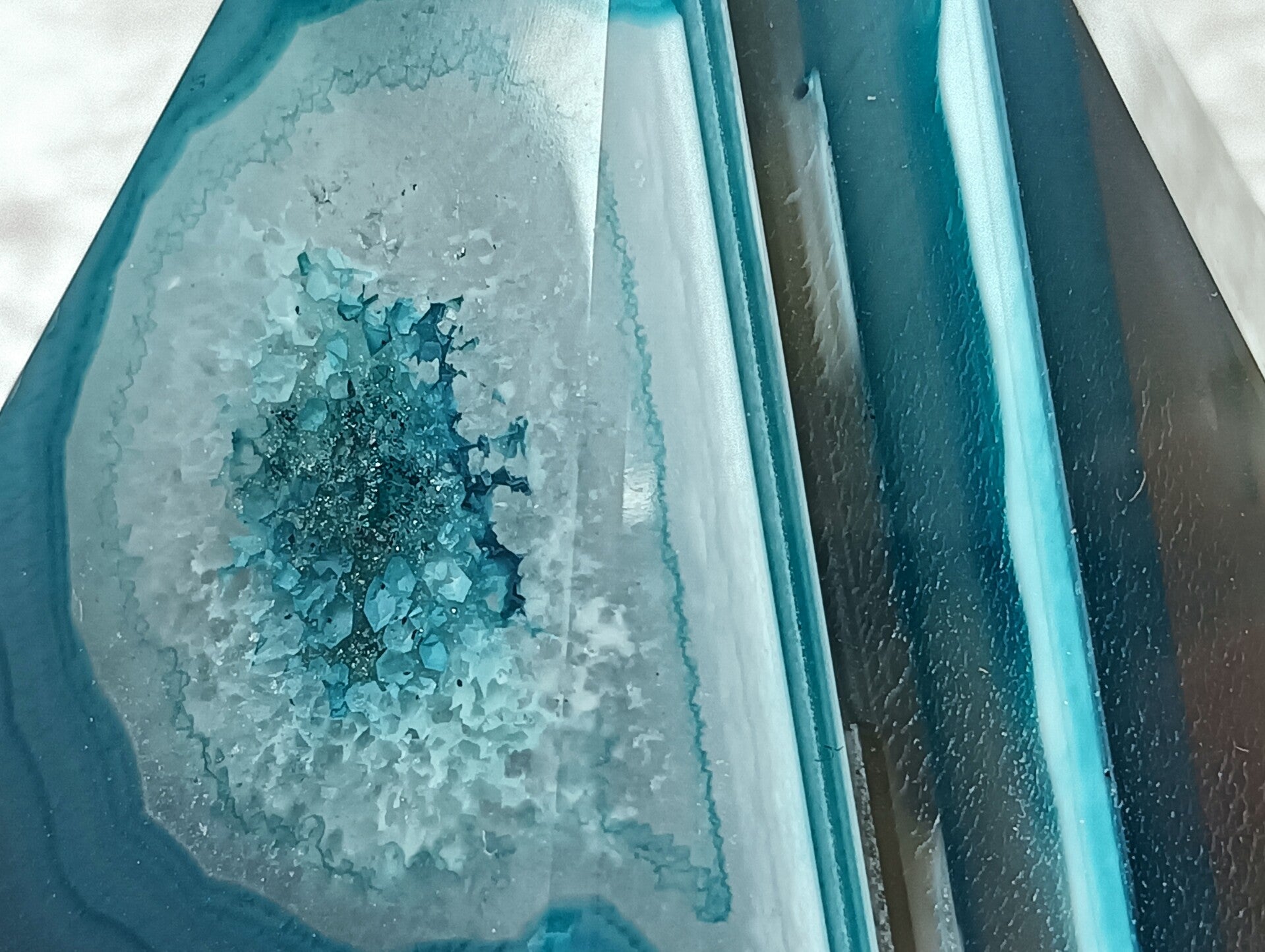 De afmetingen van deze blauw/ groen geverfde agaatschijf zijn: